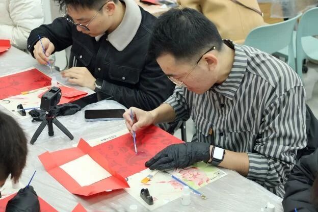 活动现场气氛热烈非凡,师生们小心翼翼地将金箔贴附于红色底板之上,勾勒出一匹匹形态各异、栩栩如生的骏马形象。今年恰逢丙午马年,大家纷纷选择以“金马贺岁”为主题进行创作,寓意马到成功、前程似锦。在创作过程中,师生们不仅沉浸于手作的乐趣,更深刻领略到了金箔艺术与传统文化的独特魅力。一片片金箔在指尖化为灵动的骏马、绚烂的烟花,为新年增添了别样的仪式感,传递着对新年的美好祝愿。