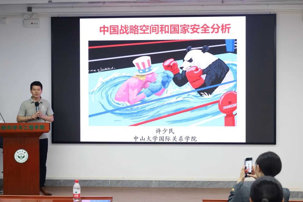 仪式伊始,许少民副教授为学员讲授《中国战略空间与国家安全分析》。他紧扣总体国家安全观,结合《国家安全法》与全球安全倡议,辨析消极安全、积极安全的核心差异,拆解中国五圈层战略空间布局,深入解读“一带一路”战略价值与中美战略竞争格局。他以现实案例引导青马学员树牢国家安全意识,以青年担当守护国家主权、安全与发展利益。