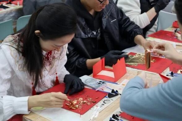 活动现场气氛热烈非凡,师生们小心翼翼地将金箔贴附于红色底板之上,勾勒出一匹匹形态各异、栩栩如生的骏马形象。今年恰逢丙午马年,大家纷纷选择以“金马贺岁”为主题进行创作,寓意马到成功、前程似锦。在创作过程中,师生们不仅沉浸于手作的乐趣,更深刻领略到了金箔艺术与传统文化的独特魅力。一片片金箔在指尖化为灵动的骏马、绚烂的烟花,为新年增添了别样的仪式感,传递着对新年的美好祝愿。
